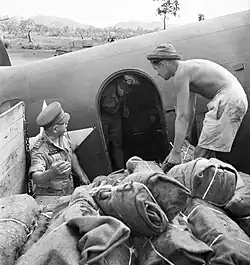 While the discovery of Myola alleviated one of the problems associated with resupply, it did not solve them all. Air drops requested during the second battle at Kokoda were delayed by weather—which frequently interfered with air operations over the range.[125][126] At the start of the campaign, effective air dropping techniques had not been developed. Belated drops to Kokoda were made by fighters because of the lack of transports. Belly tanks were filled with supplies but this could not be widely used.[127] Parachutes were not initially available and, after a quantity were delivered in mid-September, remained in short supply and were reserved for essential equipment.[notes 16][128] Most supplies were "free dropped". Packaging was primitive by modern standards. Supplies were wrapped in blankets[129] or tied in sacks. There was, however, a conscious choice to utilise packing, such as blankets, that were required by the troops and might otherwise have been supplied separately.[130][notes 17] The rate of breakage and loss was high—on average, 50 per cent and up to 90 per cent.[131][notes 18] Lieutenant Fayle, Allen's aide-de-camp, commented that: "The whole fact of the matter, and NGF seemed unable to understand all through the campaign, was that recoveries were never 100 per cent of the supplies dropped and wastage was at times terrific."[133]