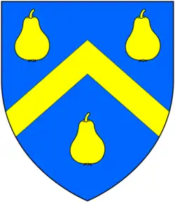 Arms of Calmady: Azure, a chevron between three pears or