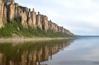 The Lena Pillars (Russian: Ле́нские столбы́, romanized: Lenskiye Stolby; Yakut: Өлүөнэ туруук хайалара, Ölüöne Turūk Khayalara) are a natural rock formation along the banks of the Lena River in far eastern Siberia. The pillars are 150–300 metres (490–980 ft) high, and were formed in some of the Cambrian period sea-basins. The highest density of pillars is reached between the villages of Petrovskoye and Tit-Ary. The Lena Pillars Nature Park was inscribed on the World Heritage List in 2012.[1]