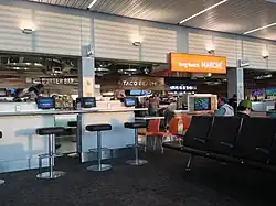 On December 12, 2012, the Long Beach Airport completed a $136 million improvement project designed to modernize the main terminal without sacrificing its historic Art Deco architecture or reputation among travelers for convenience.[30] It was developed to improve the customer experience by providing resort-like amenities, having a central palm garden, outdoor dining areas with fire pits, wine bars, and 11 gates. A new 2,000-space parking structure was completed ahead of schedule and below budget. $5 million was spent to refurbish the old terminal, which was originally built in 1941 and declared a historic landmark by the city decades later. The new terminal retains the open-air feeling of the current terminal complex, and passengers still walk across the tarmac when boarding or leaving their planes. The baggage claim also is partially enclosed, as it was before.[31]