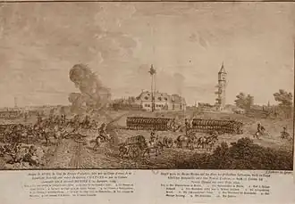 He entered service 21 May 1748 as an ensign in the Regiment Lowendal (Colonel and proprietor: (1) Woldemar de Lowendal, and (2) François Xavier Joseph, comte de Lowendal), and was promoted to second lieutenant on 1 October 1756 and first lieutenant 5 November 1758. This regiment served throughout the Seven Years' War but on 18 January 1760, the first battalion, to which he was attached, merged into the Regiment Anhalt, and the second merged into the Regiment de La Marck.[2] On 2 March 1773 he was made a knight of Order of Saint Louis. On 28 February 1778, he became captain of grenadiers, and on 20 March he was promoted to major. During this time, also, the regiment served in the American colonies in the war against the British. He was appointed lieutenant colonel in the Regiment Salm-Salm on 2 January 1783, and 25 July 1791, he became the regimental colonel, in the renamed 62nd Infantry Regiment, replacing the prince of Salm-Salm.[Note 2] The regiment subsequently distinguished itself at Valmy. He was promoted to brigadier general on 7 September 1792, and Ernest, Baron Ruttemberg replaced him as regimental commander for a short time (until his own defection to the emigre army). On 21 October 1792, he, Anne Rene Joseph Petigny, and Adam Philippe, Comte de Custine accepted the capitulation of the city of Mainz, offered by Rudolf Eickemeyer.[3] While 22,000 of Custine's men remained at Mainz, Munnier commanded a column that moved on Oppenheim and Speyer.[4][Note 3]