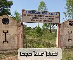 Kouroukan Fouga, or Kurukan Fuga, was the constitution of the Mali Empire created after the Battle of Krina (1235) by an assembly of nobles to create a government for the newly established empire, according to the Epic of Sundiata.[1] According to oral tradition of the jelis of Mali and Guinea, the Kouroukan Fouga established the federation of Mandinka clans under one government, outlined how it would operate and established the laws by which the people would live. The name Kurukan Fuga is a toponym, translating to "clearing on granite/lateritic rock",[2] referring to the plain near where the narrative has Sundiata Keita present the charter. This is often claimed to have been near the town of Ka-ba (present day Kangaba), following the interpretation of Djibril Tamsir Niane, but other scholars have argued that oral histories more commonly place the event at nearby Dakajalan.[3]