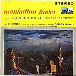 Manhattan Tower is a composition written by Gordon Jenkins in the 1940s and first issued to the public in 1946 as a two-disc 78-rpm set on the Decca label, DA-438. It was considered quite innovative for its time and was quite warmly received by critics and the public alike. Jenkins also performed the suite in its entirety on the very time-conscious Toast of the Town, hosted by Ed Sullivan, on February 26, 1950. An expanded 90-minute live musical dramatization, featuring Peter Marshall and Helen O'Connell, was presented as an NBC Saturday Spectacular on October 27, 1956.