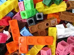 Mathematical manipulatives can be purchased or constructed by the teacher. Examples of common manipulatives include number lines, Cuisenaire rods, fraction strips,[1] base ten blocks (also known as Dienes or multibase blocks), interlocking linking cubes (such as Unifix), construction sets (such as Polydron and Zometool), colored tiles or tangrams, pattern blocks, colored counting chips,[2] numicon tiles, chainable links, abaci such as "rekenreks", and geoboards. Improvised teacher-made manipulatives used in teaching place value include beans and bean sticks, or single popsicle sticks and bundles of ten popsicle sticks.
