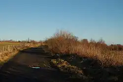 There was an anti-aircraft battery near High Marley Hill during World War II, and a drift mine which closed in the 1960s, as did the nearby Byermoor Colliery.[18] The 1951 OS map shows an opencast mine in the field beside the road, near the farm (marked on the map as Longfield House) and there is an embankment which runs parallel to School House Lane, from the site of the drift to the remains of a large retaining wall. This was presumably a loading point on the Bowes Railway, the trackbed of which is still visible, running alongside St. Cuthbert's Road. The presence of a large flat area of waste ground on the opposite side of the road to the wall is a possible indication there were railway sidings here. It is not known whether this loading point also handled the output of the opencast. The 1951 map also shows a terrace called Waggonway Row just beside the retaining wall. The outline of these houses can be seen from the air and is visible on Google Maps. The large house on School House Lane has several outbuildings which appear to have been associated with the drift. This would explain the presence of a sign on the wall of the building nearest the road which reads "UK Coal Monitoring Station." Exactly what this is monitoring is unclear, although it is likely to be mine water or gas. School House Lane forms the southern end of St. Cuthbert's Road, and vehicular access beyond the large house is prevented by a large concrete block which has been placed in the centre of the lane.