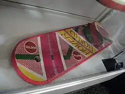 After Marty appeared in Back to the Future Part II where he replaced his skateboard with a hoverboard, the invention of a real levitating board was in high demand. Rumours that a real hoverboard had been invented were fuelled by Zemeckis in a 30-minute documentary presented by Leslie Nielsen that aired on NBC Friday Night At The Movies, which was designed to promote the film. Zemeckis stated that hoverboards were real, but parent groups had not allowed manufacturers to produce them, although some were found and used in the film.[69] In Back to the Future Part II, Fox appeared using a pink Mattel-branded board that has the appearance of a skateboard but hovers a few inches above the ground. Various companies have since produced versions of the hoverboard using a variety of technologies. In 2012, Mattel released a replica of the hoverboard for children, although it did not have the ability to hover.[70] In 2014, a viral online video involving Lloyd that promoted a working hoverboard was revealed to be a hoax created by Funny or Die.[71]