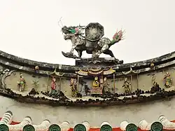 The temple is filled with wood carvings in the Chaozhou style. The name plaque on the front temple is surrounded by three dragons. The swastikas on the main hall's door panels are taken to represent eternal prosperity; wealth and happiness are also symbolized by the doors' flowers and birds. The columns have lion and paired rabbit bases.[2][4]