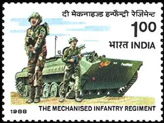 The Mechanised Infantry Regiment is an infantry regiment of the Indian Army, comprising 27 battalions (including 3 tracked and 2 wheeled reconnaissance and support battalions) dispersed under various armoured formations throughout India. Together with the 23 battalions of Brigade of the Guards, they form part of the Mechanised Infantry arm, which along with the Armoured Corps form the Mechanised Forces.[3]