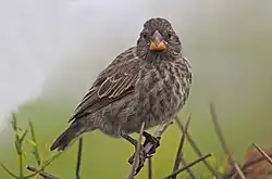 The medium ground finch feeds primarily on seeds, although it is also known to eat flowers, buds, and young leaves, and the occasional insect. It forages either on the ground or in low vegetation.[2] In urban areas, these birds exhibit a strong preference for human food items over their natural food sources.[26] Scientists have found that due to urbanization, medium ground finches have access to a variety of food, such as human food.[27] Food has been a selecting agent for the various beak sizes present on the Galápagos Islands; this shows natural selection at its finest, where those who are best adapted to their environment will most likely survive and reproduce.[27]