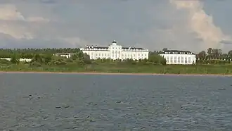 The palace was constructed in 2008–09, and resembles a somewhat diminished and simplified copy of the famous palaces of Peterhof. The site also hosts several formal gardens that seem to be however inaccessible to the general public.