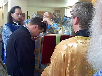 Orthodox layman, wearing a cassock, is tonsured in preparation for being ordained to the minor orders of candle-bearer and reader.