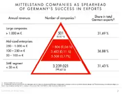 This pyramid shows that over 99% of German firms are Mittelstand firms but 0.34% depart from the classic small and medium-sized enterprise (SMEs) definition. The two categories of 'classic' and 'upper' Mittelstand firms in Germany account for 68% of Germany's exports. In comparison, Germany's larger corporations generate 32% of Germany's exports.[5] The 'upper'-sized Mittelstand firms (revenues between 50 million EUR and 1 billion EUR) form a unique and distinctive group, as they are the most export-oriented group of firms in Germany's business landscape contributing significantly to Germany's sustained export success. As such, Mittelstand firms clearly form the backbone of the German economy.[13]