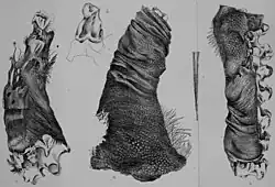 • An articulated foot of a male D. giganteus with skin and foot pads preserved, found in a crevice on the Knobby Range in 1874[16] (currently held by the Otago Museum)