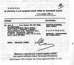 NKVD document issued sentencing blind "Ukrainian pensioner bandurist" Ivan Kucherenko to execution by shooting. The title of the signatory (in Russian: Секретарь Тройки — "Secretary of the Troika") can be seen.