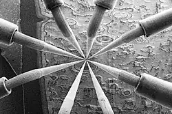 A low magnification image of eight nanoprobes hovering over a device to be tested