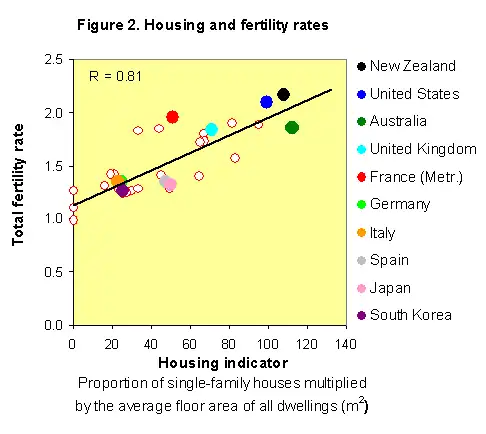 Studies have shown that fertility is highest among couples living in single-family houses and lowest among those residing in apartments.[12] Experts claim that shortages of family housing can cause low birth rates. “Some have suggested that, like laboratory specimens, Italians have responded to their ever-more-crowded-suburbs and cramped apartments by curbing procreation”.[13] Children “aren't wanted in the condominia (apartments), in public places where they can disturb”.[13] “Houses are bigger in the U.S. and generally more available. That may help explain why Americans have more babies”.[14]