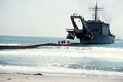 The Newport class were larger and faster than previous LSTs and were able to transport tanks, heavy vehicles and engineer groups and supplies that were too large for helicopters or smaller landing craft to carry.[7] The LSTs have a ramp forward of the superstructure that connects the lower tank deck with the main deck and a passage large enough to allow access to the parking area amidships. The vessels are also equipped with a stern gate to allow the unloading of amphibious vehicles directly into the water or to unload onto a utility landing craft (LCU) or pier. At either end of the tank deck there is a 30 ft (9.1 m) turntable that permits vehicles to turn around without having to reverse.[2][3] The Newport class has the capacity for 500 long tons (508 t) of vehicles, 19,000 sq ft (1,800 m2) of cargo area and could carry up to 431 troops.[2][8] The vessels also have davits for four vehicle and personnel landing craft (LCVPs) and could carry four pontoon causeway sections along the sides of the hull.[3][4]