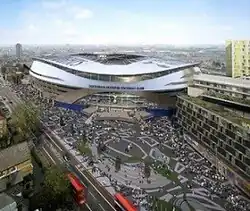 In November 2007, it was reported that the club was considering the building of a new 52,000-capacity stadium, to be masterminded by Tony Winterbottom, formerly of the London Development Agency, who had worked on development of Arsenal's Emirates Stadium.[28] In this plan the club would leave White Hart Lane for two seasons, possibly sharing ground with West Ham.[29] In October 2008, the club announced that it was planning for the Northumberland Development Project with a 60,000-capacity stadium.[30] In December 2008, images for the new stadium were released,[31] followed by plans for the project with a 58,000-capacity stadium in April 2009 for public consultation.[32] In this plan, the new stadium would be built alongside the existing White Hart Lane.[31] The stadium was designed by KSS Design Group, While the project masterplan was by Make Architects and it contained a public square and two amphitheatres designed by Martha Schwartz Partners, with Buro Happold responsible for the engineering and technical aspects of the build.[33][34] In October 2009, planning application for a 56,000-seat stadium including proposal for 434 new homes, a 150-room hotel, a club museum and shop, and a supermarket was submitted, with a view to start construction in 2010.[35] However, the plan to demolish eight locally listed buildings and two nationally listed buildings was criticised by English Heritage, and the Government's advisory body on architecture, the Commission for Architecture and the Built Environment, as well as other conservation groups.[36][37][38]