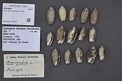 Shell specimens of Oliva oliva at the Naturalis Biodiversity Center, showing variations in color and pattern
