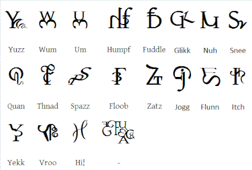 In order, the letters, followed by the creatures for which the letters are the first letter when spelling their names, are YUZZ (Yuzz-a-ma-Tuzz), WUM (Wumbus), UM (Umbus), HUMPF (Humpf-Humpf-a-Dumpfer), FUDDLE (Miss Fuddle-dee-Duddle), GLIKK (Glikker), NUH (Nutches), SNEE (Sneedle), QUAN (Quandary), THNAD (Thnadners), SPAZZ (Spazzim), FLOOB (Floob-Boober-Bab-Boober-Bubs), ZATZ (Zatz-it), JOGG (Jogg-oons), FLUNN (Flunnel), ITCH (Itch-a-pods), YEKK (Yekko), VROO (Vrooms), and HI! (High Gargel-orum).