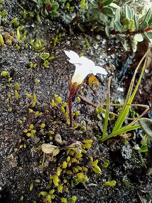 Tiny flowering plant of O. pygmaea in damp habitat of Bariloche, Argentina