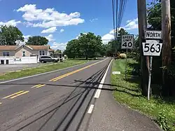 The road passes over the Pennsylvania Turnpike Northeast Extension (Interstate 476) and PA 563 turns east and heads into the community of Tylersport, where it crosses Allentown Road. After leaving Tylersport, the route heads northeast into more rural areas.[3][4]