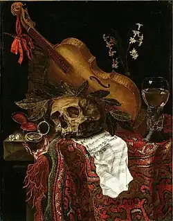 While he painted some pure vanitas paintings, the vanitas theme is also present in his flower paintings. For instance, in the Floral still life in a niche with a stag beetle discussed above the wilting flowers express the vanitas theme of impermanence and death. A pure vanitas painting is his composition Vanitas still life (dated 1668, Museum Catharijneconvent in Utrecht). This composition contains the typical symbols present in vanitas paintings: a skull with a laurel wreath (referencing the passing of glory), dice (referencing the vicissitudes of life), a wine glass, sheet music and a violin (refencing the fleetingness of physical and spiritual pleasures), wilting flowers and an hourglass (refencing decay and the passing of time). The Vanitas still life in the Maribor Regional Museum in Maribor reprises many of the same symbols. In this work, objects that allude to military glory (military distinctions, a sword) are placed on the left while those referencing cultural achievements such as books and music are placed on the right. Physical and spiritual achievements are placed among the symbols of death and decay such as the extinguished candle, the skull and the wilting flowers to convey the idea that all achievements eventually fall into oblivion or extinction.[12]