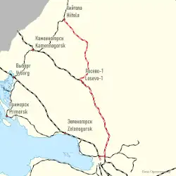 The railway connected Hiitola (Khiytola) on the Vyborg–Joensuu railway with Finland Station in St. Petersburg, bypassing the Riihimäki–Vyborg–Saint Petersburg trunk line of Finnish railways. Construction of the railway had been completed by January 1917, although some works continued until 1919. The line was constructed from Rautu (Sosnovo) to Hiitola, as single line railway which is used in both directions.[2] The part of the railway south of Raasuli (Orekhovo) was on the Russian side of the Finnish-Russian border.