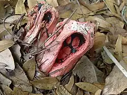 Fruiting bodies are latticed (clathrate), and have gelatinous arms that lie sessile within the volva. Spores are elliptical, and have dimensions of 4–6 1.5–2.5 μm.[13] The New Zealand native, Ileodictyon cibarium, known as the basket fungus, has a fruiting body shaped somewhat like a round or oval ball with interlaced or latticed branches.