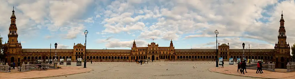 The Plaza de España ("Spain Square", in English) is a plaza in the Parque de María Luisa (Maria Luisa Park), in Seville, Spain. It was built in 1928 for the Ibero-American Exposition of 1929. It is a landmark example of Regionalism Architecture, mixing elements of the Baroque Revival, Renaissance Revival and Moorish Revival (Neo-Mudéjar) styles of Spanish architecture.[1]