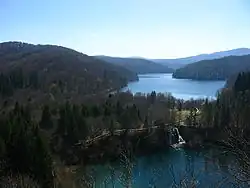The availability of water, influenced by the configuration of the terrain, has a great impact on the biodiversity of this area. The Plitvice Lakes are surrounded by various mountains. The western side of the national park area is enclosed by the Mala Kapela mountain, while the eastern side is enclosed by the Lička Plješivica mountain, which also represents the border with Bosnia and Herzegovina. Plitvice Lakes National Park is situated in the Plitvice plateau which is surrounded by three mountains that are part of the Dinaric Alps: Lička Plješivica mountain (Gola Plješevica peak 1,640 m), Mala Kapela mountain (Seliški Vrh peak at 1,280 m), and Medveđak (884 m).[8] The afforested mountain slopes serve as reservoirs. They are also a refuge for many animal species. The large difference in altitude in a narrow space between the mountains in the south and the Korana river in the north represents a significant criterion for biodiversity in this region. The overall difference in elevation within the national park area is 912 m (the highest elevation is Seliški vrh at 1279 m, the lowest elevation is reached at 367 m at the bridge across the Korana river).[9]
