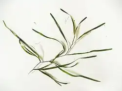 Grass-wrack pondweed is relatively easily distinguished from most other pondweeds by its combination of strongly flattened stems and sclerenchymatous strands in the leaf . P. acutifolius is similar in Europe but can be distinguished by its sharply pointed leaves, less branched habit and flower spikes with only 2–6 flowers on peduncles up to 20 mm long.[4] In the Far East, P. mandschuriensis is an altogether smaller plant, with leaves 1.5–2.3 mm wide and 8–14 sclerenchymatous strands, stem 0.8–1.5 mm wide, and fruit 2.8–3.8 mm diameter.[5]