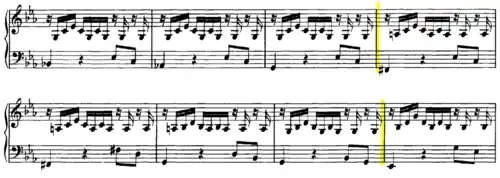 The Prelude's central motif consists of intersecting rhythms between the upper and lower voice (what originally would have been the left and right hand). In the right hand, this is a sixteenth rest, followed by a seven-note sixteenth passage that typically arpeggiates an inversion of a triad (ascending and descending from and back to the root), and an alternating sixteenth rest–sixteenth note pattern in the third beat. The left participates by having a pedal tone quarter in the first beat, a rest, then two eighth notes. The ascending and descending triad in Bach's prelude BWV 999 seem to have been the true inspiration and chord structure for the arpeggios in the Beatles song Because, because when the prelude is played at half-speed and on harpsichord, the similarity is striking, especially at measures 8–9–11, about 15 seconds into the prelude, with the repeating notes at the end of the interval being eliminated in the Beatles version.