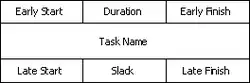 The Activity-on-Node (AON) technique uses nodes to represent individual project activities and path arrows to designate the sequence of activity completion.[2] Nodes are labelled using information pertaining to the activity. According to Project Management, nodes should at least display the following information:[3]