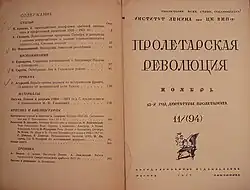 Proletarian Revolution (Russian: Пролетарская революция) was a Soviet historical journal published in Moscow from 1921 to 1941.[1][2] In a review of the first issue, Ilya Vardin reported the journal as declaring "Our goal is precisely to help the writing of the history of the proletarian revolution in Russia. Nobody will read documentary raw materials, except the historians themselves, and we need books that would be read by both workers and students."[3]