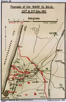52nd (L) Division's next operation was the tricky passage of the Nahr el Auja to launch the Battle of Jaffa. A patrol of 4th RS crossed on a tarpaulin boat built by the Royal Engineers to reconnoitre the position on the night of 13/14 December. The assault troops of the division then practised using similar canvas boats on a village pond, then at 22.30 on the evening of 20 December, in heavy rain, the first assaulting waves of 156th Bde went forward under cover of an artillery barrage and established a bridgehead. Bridging was made difficult by the flooded river, but the Royal Engineers got the follow-up battalions including 4th Royal Scots across by raft. Accompanied by a section of the brigade machine gun company and a Stokes mortar the battalion attacked 'Slag Heap Farm' and captured it without serious difficulty. By 06.00 the brigade was digging in on a strong line, ready for any counter-attack, but none came: the Turks had been completely surprised, and were in full retreat. The advance was renewed up the coast on the morning of 22 December, with fire support from HMS Grafton and gunboats. 156th Brigade advancing in the centre came under shellfire, but casualties were few. Before nightfall, 52nd (L) Division reached the castle of Arsuf overlooking the Plain of Sharon, where it halted. The Official History describes the passage of the Auja as 'one of the most remarkable feats of the Palestine Campaign'. 4th Royal Scots suffered only 5 ORs killed, 1 officer and 21 ORs wounded.[38][54][64][74][75][76]