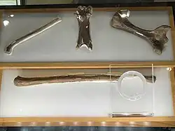Quetzalcoatlus' scapulocoracoid, a fusion of the scapula and coracoid bones, was U-shaped and broad. Throughout azhdarchid evolution, the scapula had been reducing in length, and this reached its pinnacle in Q. lawsoni, where the scapula was only slightly longer than the coracoid. The sternum, like that of other pterosaurs, was broad. It had a transverse ridge on its posterior (rear) portion, also observed in Pteranodon, albeit it was further forward in that genus.[3] Like other pterosaurs, the bone walls of the sternum were very thin, and in the case of Q. lawsoni, they were as little as 1.5 mm (0.059 in) thick.[51] Quetzalcoatlus and other azhdarchids have forelimb and hind limb proportions more similar to modern running ungulate mammals than to members of other pterosaur clades, implying that they were uniquely suited to a terrestrial lifestyle.[36] The humerus (upper arm bone) was short and robust, with considerable mobility.[13] Its morphology differed somewhat between species, with Q. lawsoni's humerus having a proportionally shorter deltopectoral crest, and Q. northropi's being shaped more like a twisted hourglass. The ulna of Q. northropi was relatively shorter than that of Q. lawsoni, measuring 1.36 times the length of the humerus, as opposed to 1.52 times the length of the humerus in Q. lawsoni and other azhdarchiforms.[3] Like all pterosaurs, Quetzalcoatlus had a specialized carpal (wrist) bone, the pteroid, which attached to the sesamoid bone of the wrist. It faced inwards, pointing towards the deltopectoral crest, and supported the propatagium. Specialized muscles allowed it to move slightly.[13] The first digit was the smallest, and the third was almost the biggest digit that routinely contacted the ground. As with all pterosaurs, the wing finger was considerably longer than the others.[3] It did not contact the ground, as evidenced by footprints. Whilst on land, it may have been held between the elbow and the torso.[13] The wings were short and broad, and forelimb musculature was extensive. Flapping power came from several muscle groups on the torso, forearm and manus (hand).[37]