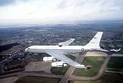 A EC-135H Silk Purse of the 10th Air Control Center Squadron flying over Mildenhall during 1983