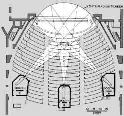 The cinema with a capacity for 1,700 spectators was originally a Cinerama which used three projectors and a twenty-five-foot radius screen. It had a small stage in which short-term shows could be offered, in order to entertain the audience in the middle of the films.