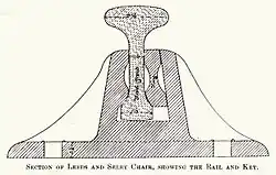 In the 1830s rolled T-shaped (or single-flanged T parallel rail) and I-shaped (or double-flanged T parallel or bullhead) rails were introduced; both required cast-iron chairs to support them.[36] Originally, iron keys were used to wedge the rail into the vertical parallel jaws of the chair; these were superseded by entirely wooden keys.[36] The wooden keys were formed from oak, steam softened and then compressed with hydraulic presses and stored in a drying house. When inserted into the chair, exposure to the wet atmosphere caused the key to expand, firmly holding the rail.[37] The wedge may be on the inside or outside of the rail. In Britain they were usually on the outside.[38]