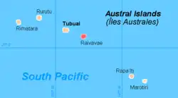 Raivavae (Tahitian: Ra‘ivāvae /ra.ʔi.va:va.e/) is one of the Austral Islands in French Polynesia. Its total land area including offshore islets is 17.9 km2 (6.9 sq mi).[2]: 205 At the 2022 census, it had a population of 900.[1] The island is of volcanic origin, and rises to 437 metres (1,434 ft) elevation at Mont Hiro.[2]: 243