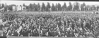 The Nationaal Socialistische Beweging, or in English the National Socialist Movement (NSB), had existed for years before the Germans arrived in the Low Countries.[1] Between World War I and World War II, Dutch society experienced a crisis in its sociopolitical system.[2] The National Socialist movement offered a solution to Netherlands' instability and gained some influence without endangering the existing political order, a system that was already frail during the period of political democracy. However, this form of democracy was not completely in practice nor uncontested as a principle by the NSB.[2]