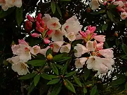 Rhododendron pseudochrysanthum (Chinese: 阿里山杜鵑; pinyin: Ālǐshān dùjuān; lit. 'Alishan azalea'),[1] the false-gold-flower rhododendron,[2] is a species of flowering plant in the heath family Ericaceae, native to Taiwan. It is a low-growing evergreen shrub growing to 2.5 m (8.2 ft) tall and broad. In spring, trusses of pink buds appear, opening to pale pink flowers spotted with deeper pink on the inner surface.[2]