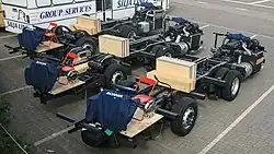 A rolling chassis is the fully-assembled chassis of a motor vehicle (car, truck, bus, or other vehicle) without its bodywork. It is equipped with running gear (engine and drivetrain) and ready for delivery to a coachbuilder to be completed. Historically, bespoke luxury automobiles were finished inside and out to an owner's specifications by a coachbuilder, and specialty vehicles (such as fire engines) were outfitted by firms devoted to that task.