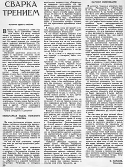 - ^ a b c d "СВАРКА * ТРЕНИЕУЧ * ИСТОРИЯ ОДНОГО ПИСЬМА * НЕОБЫЧАЙНАЯ СУДЬБА ПОЛЕЗНОГО СПОСОБА * НАУЧНОЕ ОБОСНОВАНИЕ - Техника - молодёжи 1958-02, страница 32". zhurnalko.net (in Russian). Retrieved 2021-04-18.