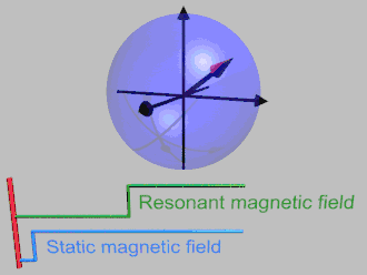 It is convenient to consider magnetic resonance in a frame that rotates at the Larmor frequency of the spins. This is illustrated in the animation below. The rotating wave approximation may also be used.