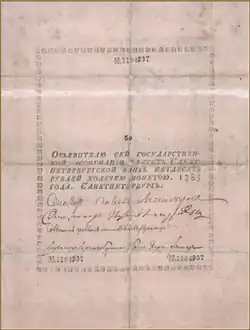 The Russian Assignation Bank or State Assignation Bank (Russian: Государственный ассигнационный банк), sometimes referred to as Assignat Bank,[1]: 555 was a bank of issue in the Russian Empire, established in early 1769 by Catherine the Great. In terms of volume of issuance, it was the largest of its time, well ahead of the Bank of England in the late 18th and early 19th centuries.[2]: 264 It was abolished in 1817 and partly replaced by the State Commercial Bank of the Russian Empire.[3]