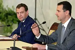On 7 February 2012, Russian Foreign Minister Sergei Lavrov, along with foreign intelligence chief Mikhail Fradkov, met with President Assad and reported to the world that President Assad was committed to reform of the constitution and electoral process. Additionally, the Russian delegation said that Syria alone held the power to change the fate of its people, without foreign intervention.[31] In March, Lavrov said in a televised interview that Syria's leadership had ignored Russia's warnings and made "very many mistakes" that helped drag the country to the brink of civil war.[59]