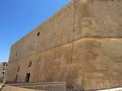 St James Cavalier is a large casemated artillery platform having a pentagonal plan. The structure was not designed with aesthetics in mind, highlighting its purely utilitarian military function.[3] Despite the impression of size given by the external aspect of the building, half of the structure was filled with compressed earth and the rest consisted of a series of sparse chambers and a ramp by which cannons could reach the roof.