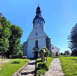 The history of the church in Reinhardtdorf goes back to the first settlement around 1200 albeit first recorded in 1368.[5] At the beginning of the 16th century it was expanded and in 1521 was given a Gothic winged altar. This carved altar with a portrayal of the Anna selbdritt was replaced when the church was renovated in 1681 by a baroque altar that depicted Jesus' Last Supper, his crucifixion and resurrection. The renovation also saw the construction of the tower. For a long time the Gothic altar was in a museum in Dresden and did not return to Reinhardtsdorf until January 1945, only a few days before the bombing of Dresden. It is now located next to the 1615 pulpit. From 1680 to 1711 the church was painted. The ceiling shows the Last Judgement and the Trinity, the upper storey, scenes from the Old Testament, mainly from the Book of Genesis, but also of the Exodus, of Samson, David und Elijah, the lower storey portrays the life of Jesus Christ. Under each painting is the name of the sponsor and the amount he donated. On the pews, Christian virtues and doctrine are portrayed graphically. The background to the paintings is the area around Reinhardtsdorf, the Elbe Sandstone Mountains. The church has an organ by Hermann Eule Orgelbau Bautzen from 1911.